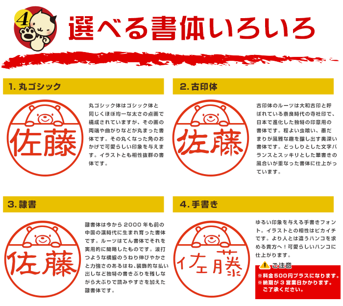 書体で「手書き」をご選択の場合 ※料金に500円(税別)が追加になります。